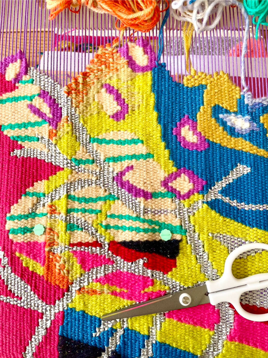 織りの中でも時間と労力のかかる綴れ(つづれ)という技法だからこそ、言葉ではうまく表せない自分の気持ちを織り込むことができるのではないか、そう感じながら制作を続けている。